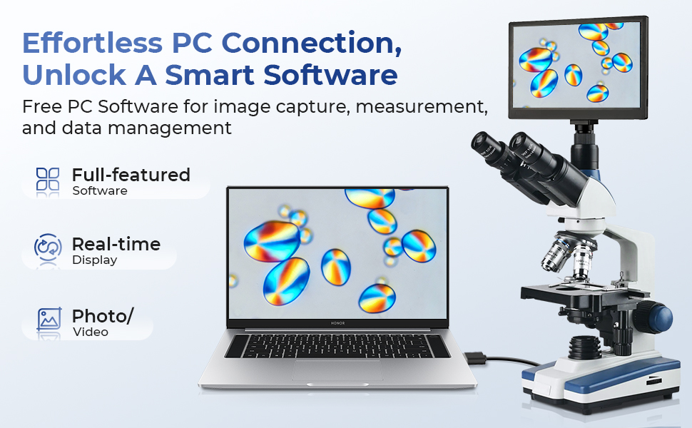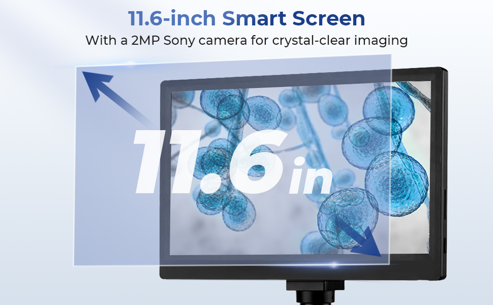 - * 11.6" Smart Display with Sony Camera: Say goodbye to eye strain. This lab microscope’s massive 11.6” HD screen offers a comfortable, clear view for individuals or groups. The integrated 2MP Sony sensor lets you capture stunning photos and videos with one click, and you can easily connect to a PC for even larger-screen analysis with the included full-featured software (for free!).