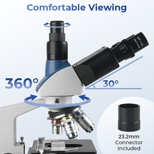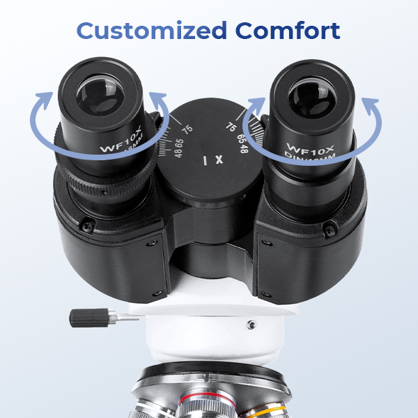 - * Ergonomic Design for Ultimate Comfort: To customize the lab microscope to your viewing comfort, the eyepiece spacing can be easily adjusted from 48mm to 75mm. A ±5 diopter is available on the left ocular tube to compensate for asymmetry, and the ocular tubes are angled at 30° to accommodate a seated position without neck strain. The head can also be rotated 360° to accommodate multiple users.