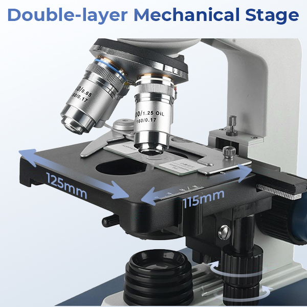 - * Precision Double-Layer Mechanical Stage: The 125×115mm stage comes with specimen clips and a micrometer for 1.0mm precise movement along X and Y axes. Effortlessly explore different parts of your samples and return to exact positions. Low-handed coarse and fine focus, with 20mm coarse travel and 0.002mm fine precision, ensures fast, accurate focusing without repeated adjustments.