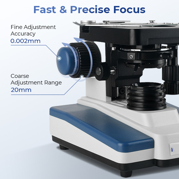 With low-position coaxial coarse and fine focus knobs on both sides, our compound microscope provides a 20mm coarse travel and a 0.002mm fine precision. You can quickly find the target and pinpoint the details, saving you time and frustration during long sessions.