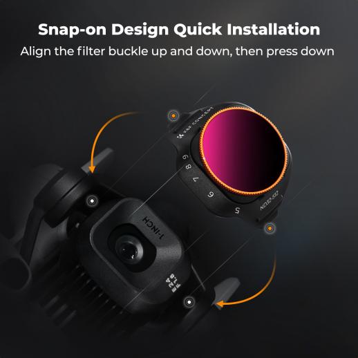 - * Variable ND Filter: Advanced adjustable neutral density filter ranging from ND32 to ND512, offering 5-9 stops of light control for precise exposure adjustments in aerial photography
