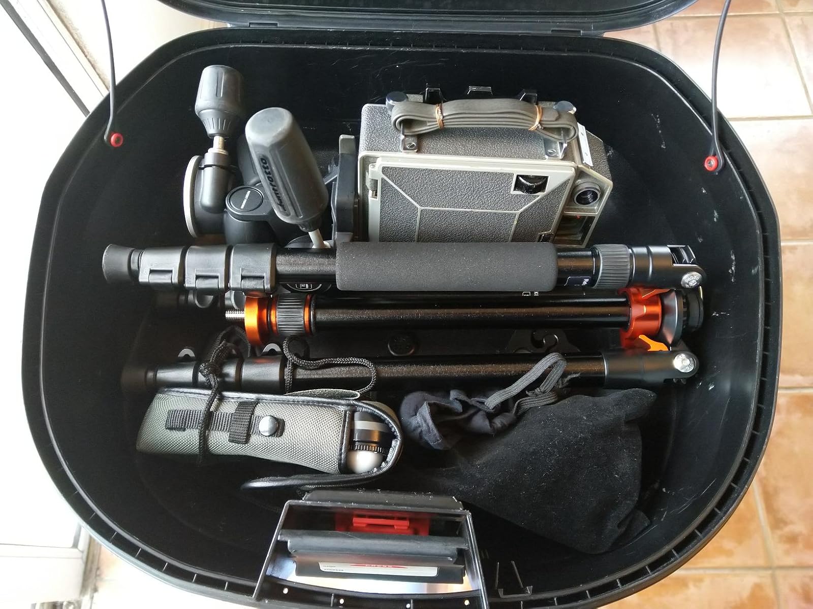 I needed a smaller, but still solid tripod to fit in the back box of my Honda 50, along with a large medium format camera, for local photo-trips. I measured the back box interior and noted the dimensions information that was given with the tripod, and it fits perfectly (see photo).
