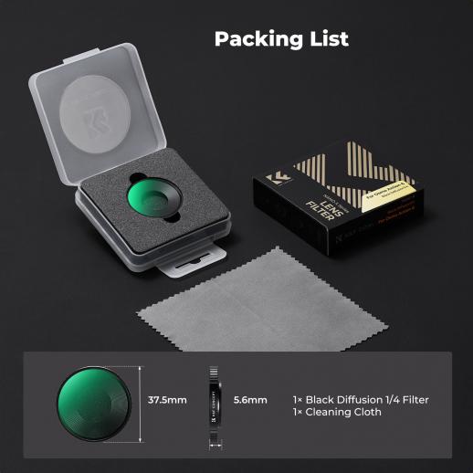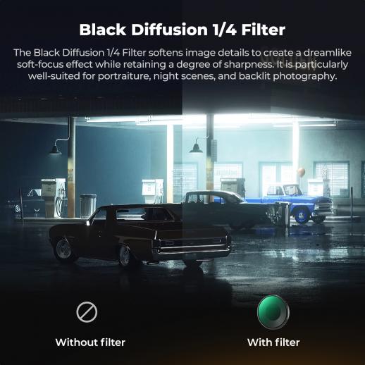 - * 【Black Diffusion 1/4 】 Dreamy Cinema Effect, the black mist 1/4 filter softens highlights and reduces glare, creating a hazy, dreamy effect that enhances the cinematic quality of the image and is perfectly suited for creating an ambient and cinematic visual effect