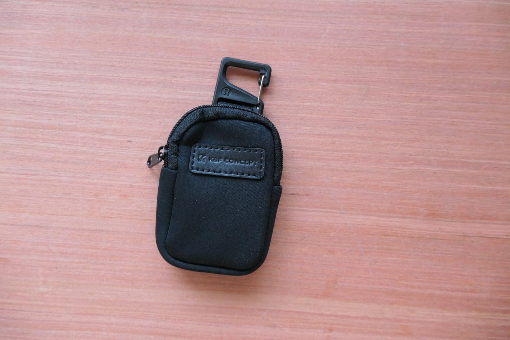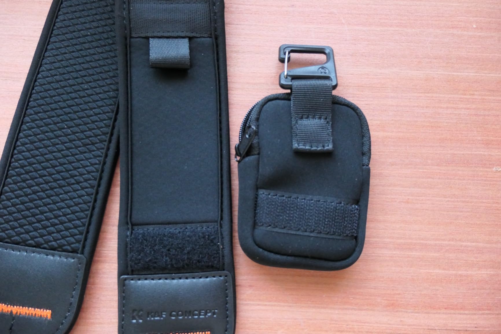There is a little pouch as well that attaches to the strap with a small carabiner and some velcro. When attached in both ways it’s quite secure and safe to carry a spare battery or some memory cards in.