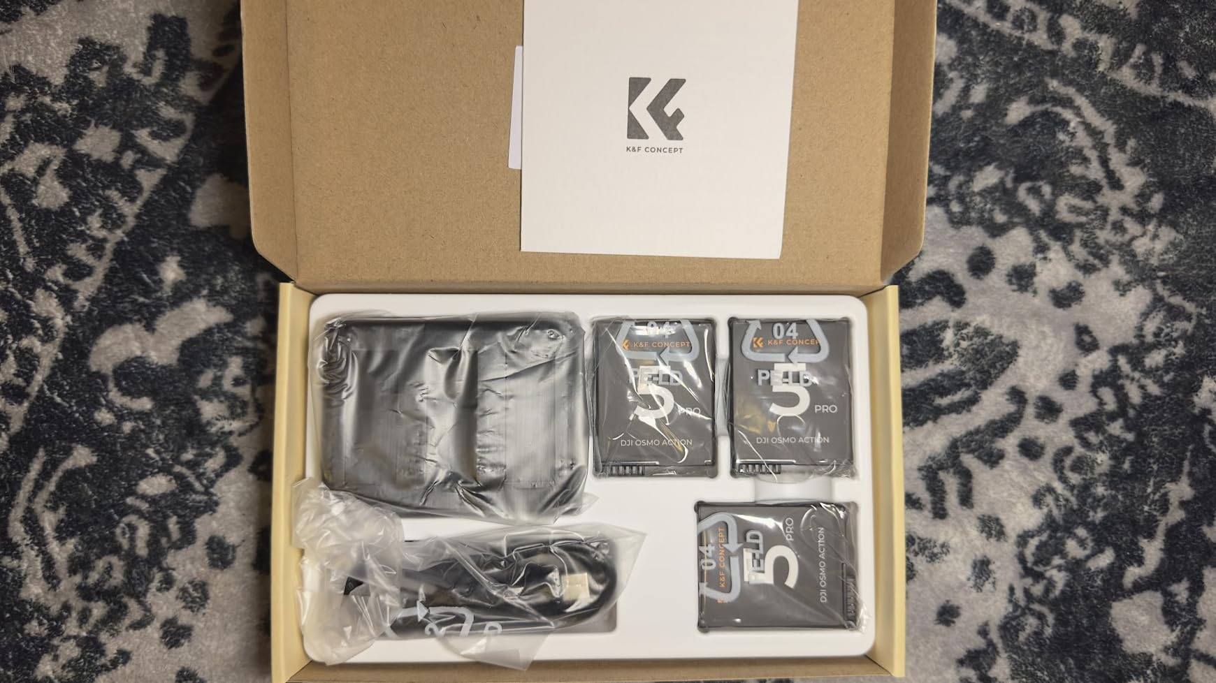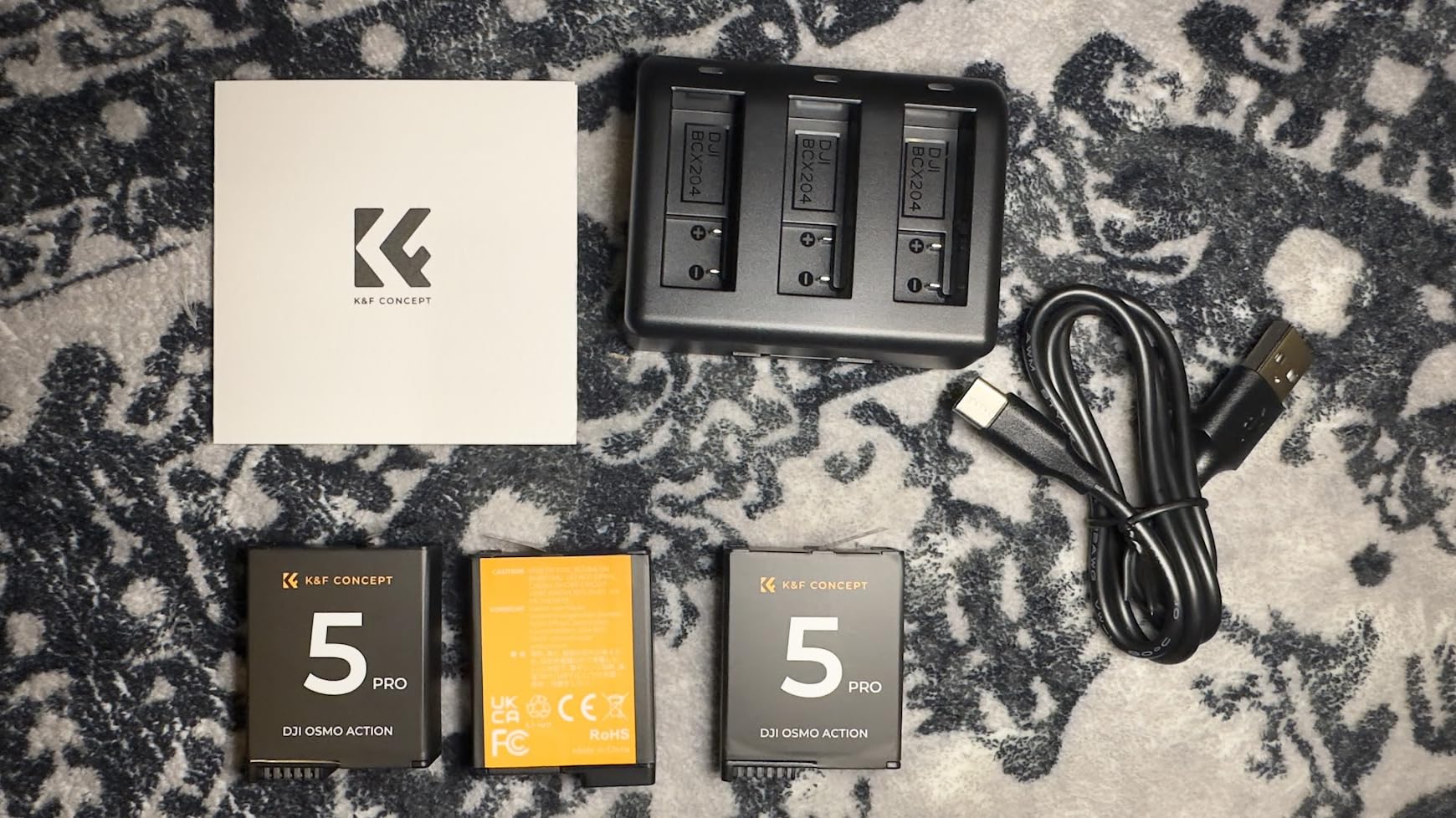 As usual, the items come in a K&F branded box. Inside is the charger, the 3 batteries and the USB-C charging lead. Note, you will need a power supply. I used a multi-USB Fast Charger that I had purchased separately. The batteries did arrive drained, so I did need to charge them before use. Charging times are not especially fast, nor are they slow. Around 4 hours for all of them to be charged. I suspect it would be quicker if I were charging one at a time. My only minor criticism is that I wish there were a better indicator other than red or green. At least an amber, or better still, a percentage meter. However, considering the price, this is a minor quibble. With regards to use with my Osmo Action 5 Pro, the batteries worked really well. I have used two of the 3 so far. I was just shy of the advertised 120 minutes of recording time. I achieved 110 minutes the first time, and 118 on the second time. But those times are similar to the times I get with the original Osmo battery. I had no issues with the batteries feeling hot whilst they charged (they barely got warm, let alone hot), and having had other batteries from K&F, I trust them to be safe. All in all, they are hard to fault, and therefore worthy of the full 5 stars.