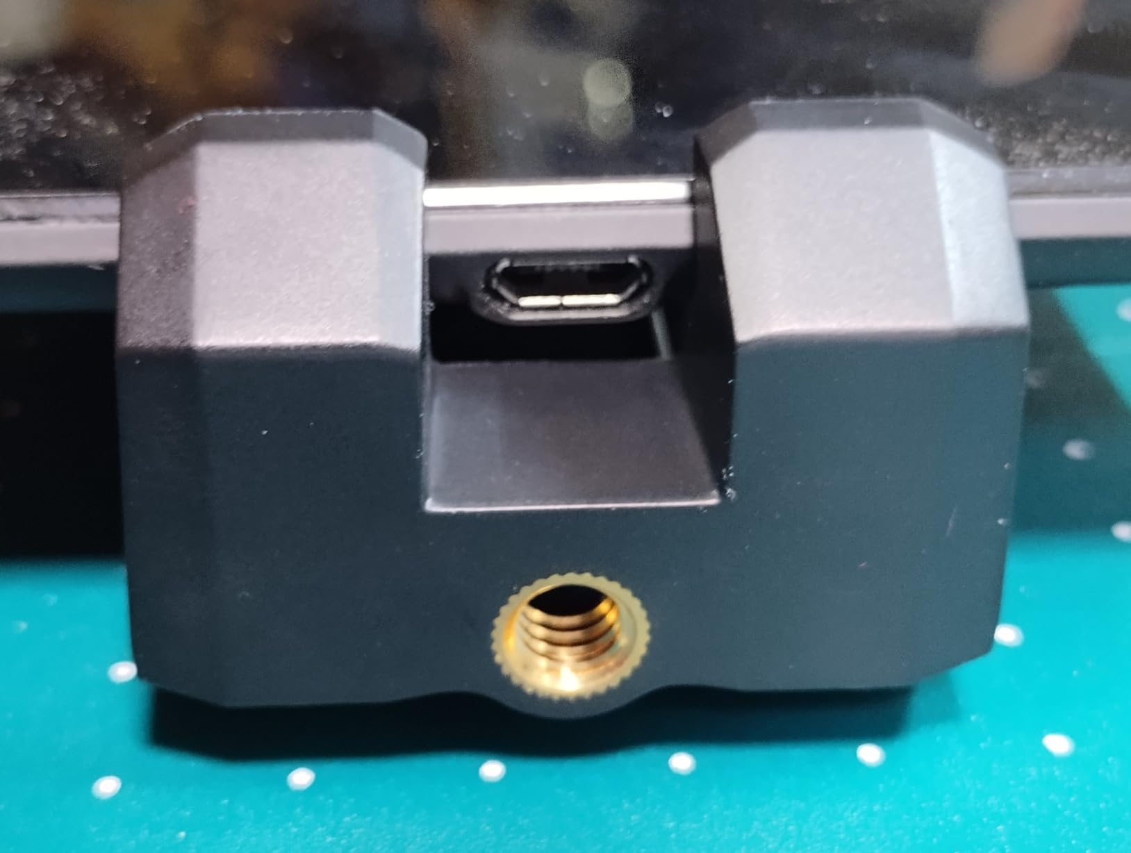 Tiene soporte para acoplarle un trípode tanto en la parte trasera como en uno de los cantos, de forma que se pueda usar tanto en vertical como horizontal.