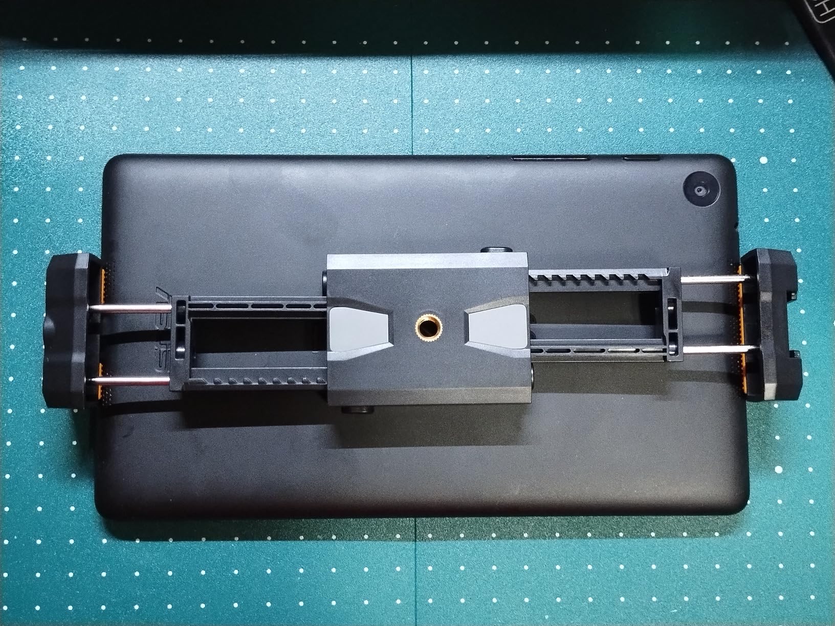 Even when it’s expanded for a tablet, it’s still very sturdy and stable, no wobble. Resizing it is quick and very easy. There are two standard 0.25 inch mounting screw holes on the bottom and the side to facilitate either landscape or portrait orientation.