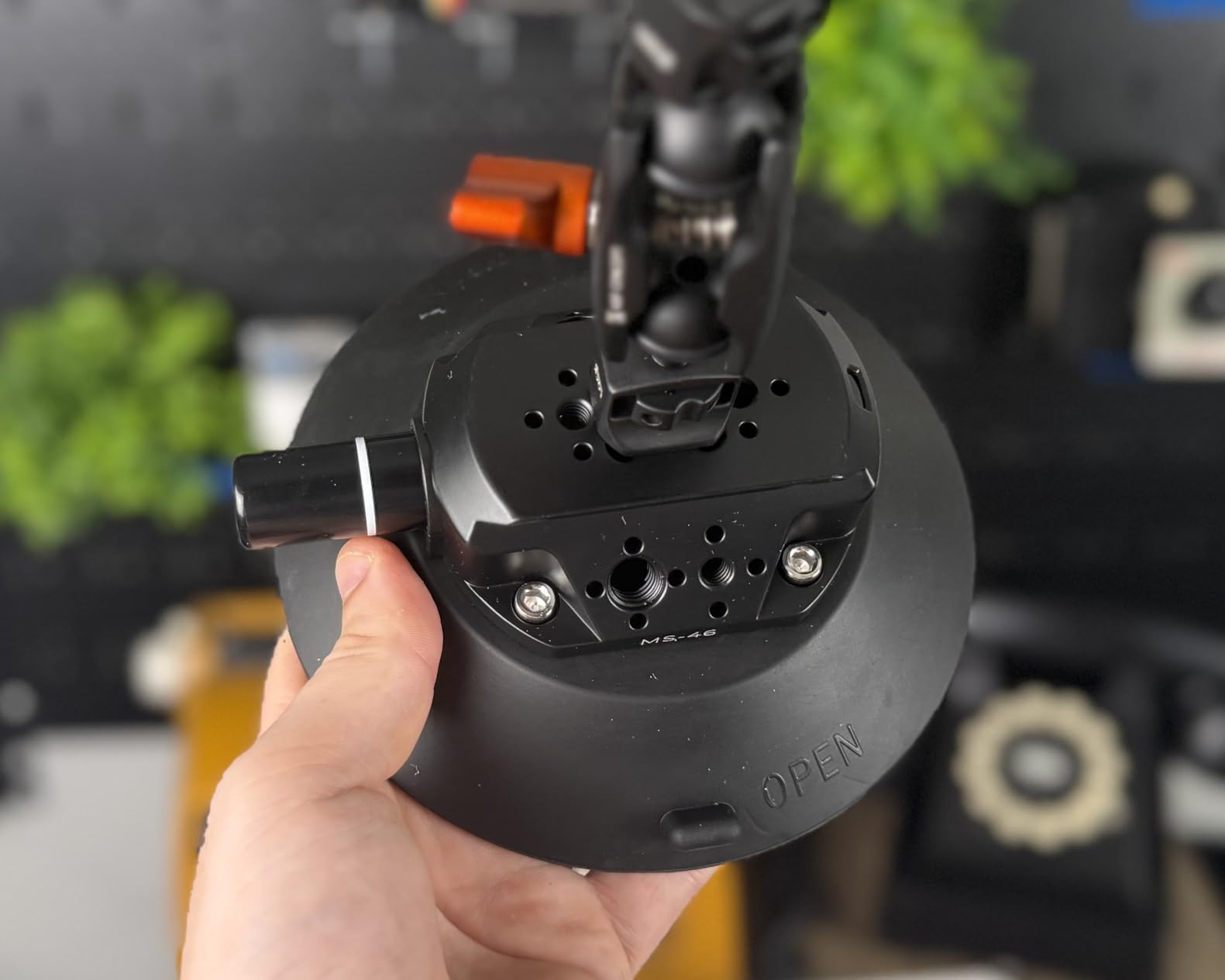 This suction cup camera mount is an impressively robust bit of kit that balances versatility with build quality. The first thing you notice is the sheer size of the suction cup – it’s large, heavy duty, and inspires immediate confidence. Once it locks on, it stays put, whether that’s on a window, desk, car panel or even a smooth painted wall. The pump-activated suction system even has a built-in safety indicator so you can monitor it over long sessions.