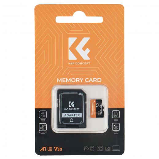 K&F Concept microSDXC UHS-I memory card 64GB SD card + adapter (U3, V30, A1, Class 10, 4K Full HD videos, for surveillance cameras, wildlife cameras and dashcams) The micro SD card comes with an adapter packed in a blister