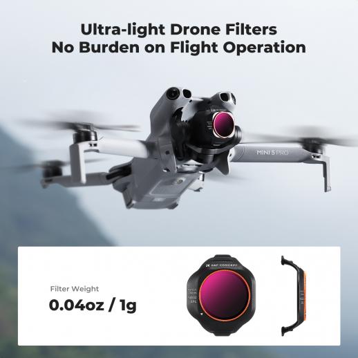 - * [Dedicated for Mini 5 Pro]: This ND & CPL Filter kit from K&F CONCEPT is speicially designed for DJI Mini 5 Pro, adopt snap-fit design for gap-free installation, lightweight to ensure gimbal safe, it's made of HD optical glass that ensure crystal clear imaging during aerial shooting, it's a game-changer for getting clean shots.