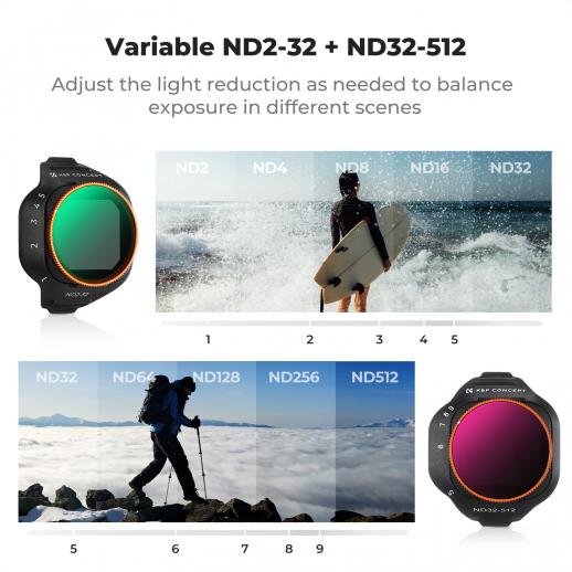 - * [Light Reduction Effect] ND2-32 provides 1-5 stop light reduction, ND32-512 provides 5-9 stop light reduction, variable nd filter can be adjusted according to photography scene need