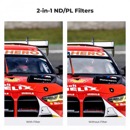 - * Dual Functionality: Combines neutral density (ND) and polarizing (PL) effects in each filter, allowing for exposure control while reducing glare and enhancing color saturation