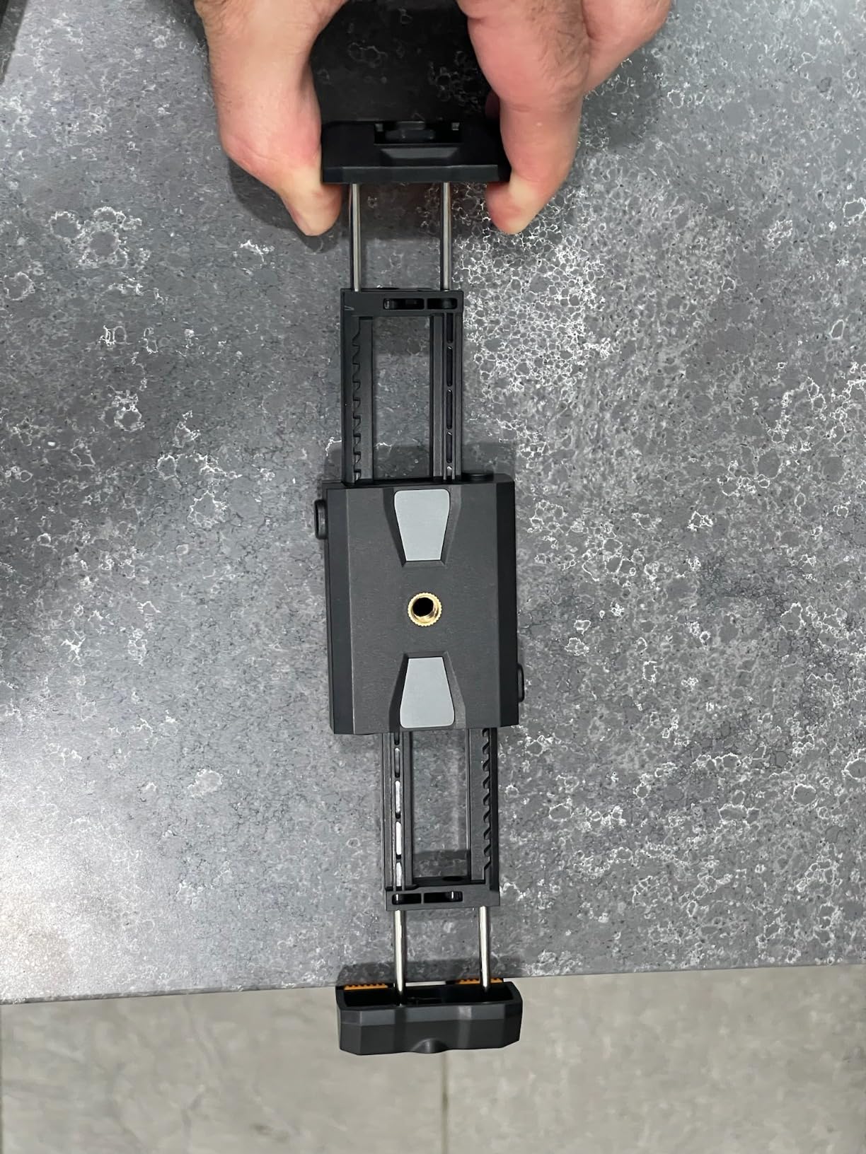 Well-built and well-designed, this mount can handle anything from a phone to a (modest-sized) tablet (caps out at 9.7", which unfortunately rules out most iPads). It extends in two ways: the metal rods are spring-loaded and stretch/compress with pretty strong grip; there's also a pair of plastic columns that deploy with a pair of button releases (see picture) that add another few inches of width, if needed. The surface is mostly a nice, smooth, grippy, rubberized coating. There are 1/4" screw mounts on one side and on the back, and a cold-shoe mount on the other side. Very nice quality device from reliable K&F Concept.