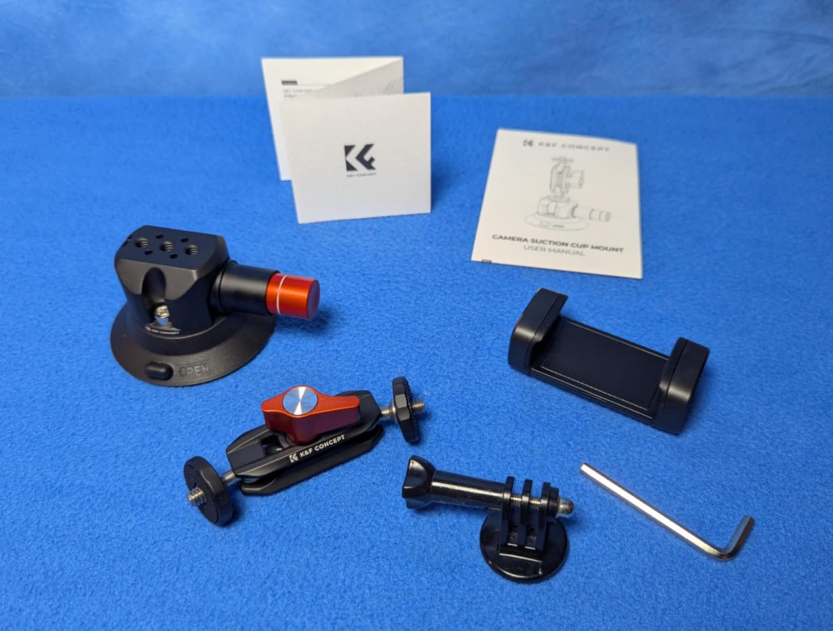 The K&F Concept Camera Mount came in a box (15.2 cm 7.1 cm x 16.3 cm) with the User manual, Website paper, Suction cup, Magic arm, Phone holder, Action cam adapter, and Allen wrench.