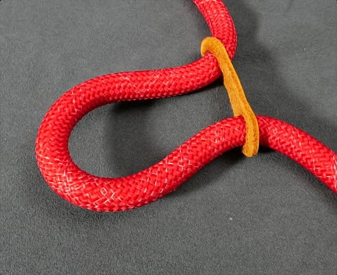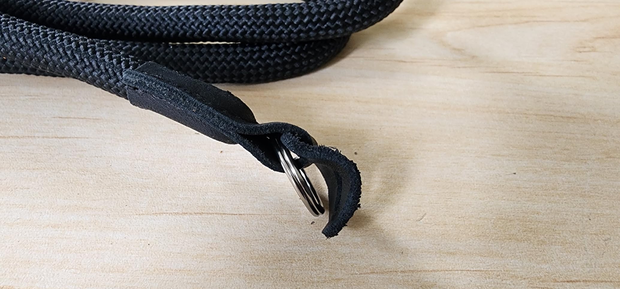 In the event that a once metre strap is too long for you, there is a short leather strap with a hole at both ends through which the climbing rope passes. If you pull a loop through, the leather grips the ends of the loop sufficiently tightly to hold onto it, thereby shortening it to whatever length you find comfortable.